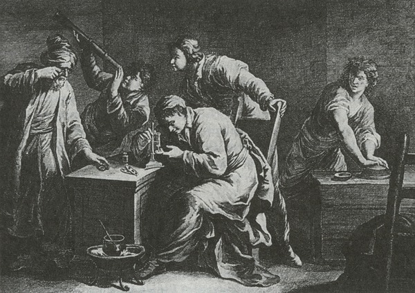 Depiction of the process of producing lenses and optical apparatus. In the background, a man gazes through a refracting telescope.