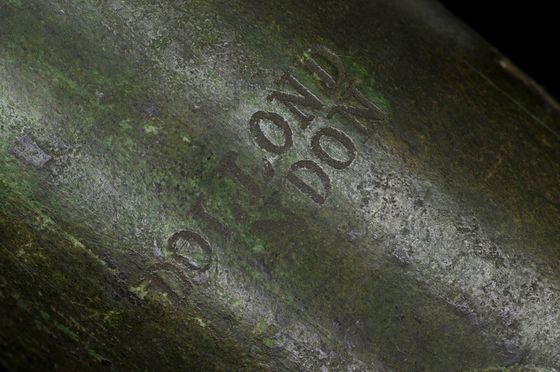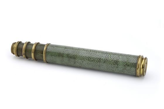 "The barrel of this hand-held telescope is covered in rayskin (shagreen) that has been dyed green, while the three draw tubes are made of green vellum. Stop lines marked with dots on the draw tubes indicate the optimum working length of the telescope. The brass fittings include sliding eyepiece and objective lens covers. The telescope has an achromatic objective lens, the patent for which was taken out by John Dollond (1706–61) in 1758. John's son, Peter (1731–1820), had founded the company whose name is stamped on one of the draw tubes: 'DOLLOND / LONDON'" (Royal Museums Greenwich).
