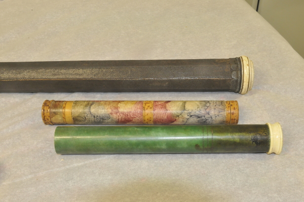 "The octagonal barrel of this non-achromatic telescope is quite typical of telescopes of this relatively early date. It is covered with black sharkskin. Both the eyepiece and objective lenses are set in ivory mounts and have ivory screw-on caps. There is a single draw tube covered in green leather with a small amount of gold-tooled decoration. The draw tube also has three stop lines, each made up of rings of gold-tooled circles. The maker's name is inscribed on the ivory fitting for the objective lens" (Royal Museums Greenwich). Greenwich website suggests H. Huguenin as a maker and suggests year made as circa 1670.