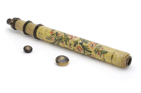 "The papier-mâché barrel of this non-achromatic telescope is decorated with coloured floral motifs. The fittings are made of horn and include screw-on caps for both ends. Stop lines on the three draw tubes indicate the telescope's optimum working length. The telescope may be Italian, since the decoration is similar to that on a telescope made in Venice, although there are also similarities to papier-mâché items produced in Russia in the eighteenth and nineteenth centuries" (Royal Museums Greenwich).