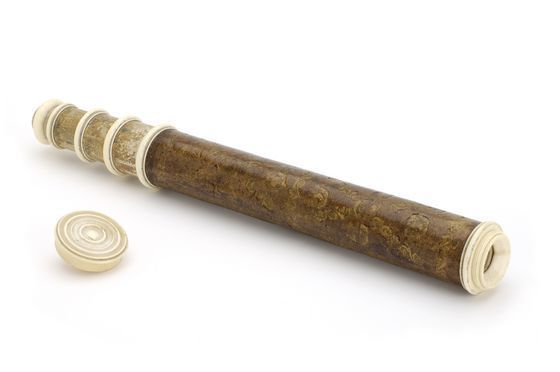 "This non-achromatic telescope has a leather barrel decorated with gold-tooled motifs. There are three draw tubes made of marbled paper. The other fittings are of turned ivory, including a screw-on cap for the objective lens (the eyepiece cap is missing). Telescopes in this period had to be quite long, since lenses with long focal lengths were used in order to minimise chromatic aberration - the appearance of coloured fringes around the object being viewed. Stop lines drawn onto the draw tubes of this telescope indicate an optimum working length of about 812 mm" (Royal Museums Greenwich).