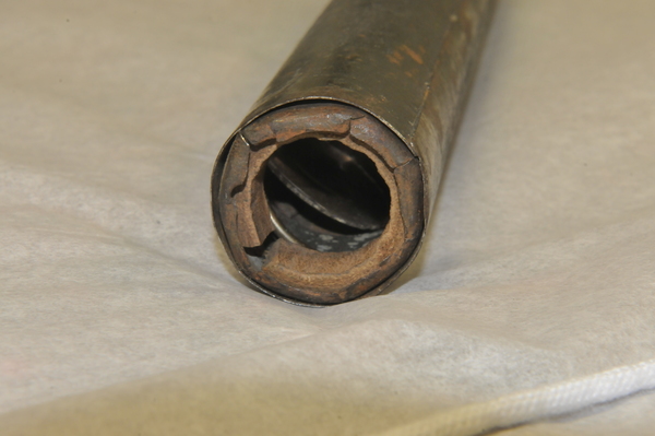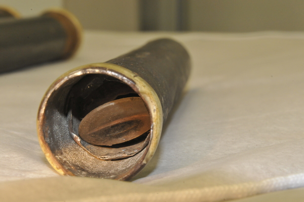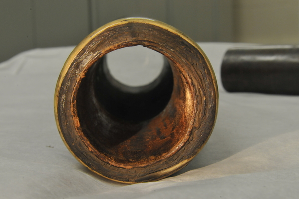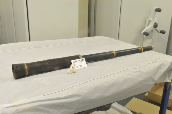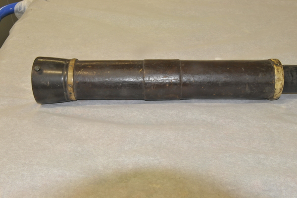 Main tube of wood. Draws 1 and 2 pasteboard. Draw 3 sheet metal. No clear extension marks. Eyepiece lenses now off-axis, but rough image is visible with objective focal length 610 mm and effective eyepiece at 80 for magnification of ca. 8x. Last (eyeside) third of main tube has an inner tube, which decreases the inner diameter of the main tube to meet the outer diameter of Draw 1. (Potential explanation: This functions as a stop on the objective - nearly half (in diameter) of a light beam incident on the objective is blocked by this lip and does not pass into Draw 1.) Inside tube begins at ca. 190 mm away from light source of the 610 mm focal length. Opening of this inner tube: 41 mm at eyeside vs. 47 mm at objective aperture. Metal tube of innermost tube brings to mind the metal tube telescopes at Skokloster and in Kassel, which likely date from the 1660s and 1670s.