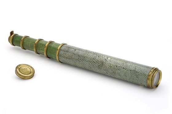 "The telescope barrel is covered in rayskin (shagreen) that has been dyed green, while the four draw tubes are made of green vellum. Black stop lines on the draw tubes indicate the optimum working length of the telescope, which is over 1000 mm. The brass fittings include a sliding eyepiece cover and screw-on objective lens cover. This is an early example of an achromatic telescope. The achromatic lens was first developed in 1757 by the London instrument maker John Dollond (1706-61)" (Royal Museums Greenwich).