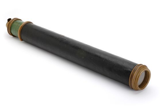 "This non-achromatic telescope has a leather-covered barrel and a single draw tube made of green vellum. The fittings are of boxwood and brass, including a sliding eyepiece cover. The screw-on objective lens cap is now missing. A ring of black dots on the draw tube acts as a stop line, indicating the approximate working length of the telescope. It has a large non-achromatic objective lens to allow as much light as possible to enter the telescope. The telescope doesn’t have extra lenses to correct the inversion of the image, since the more lenses a telescope has, the greater the loss of light. The production of inverted images is typical of night telescopes" (Royal Museums Greenwich).