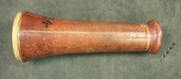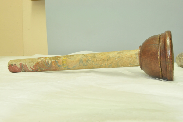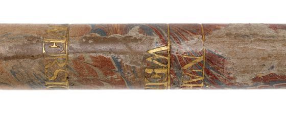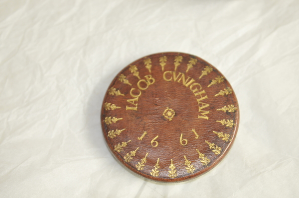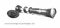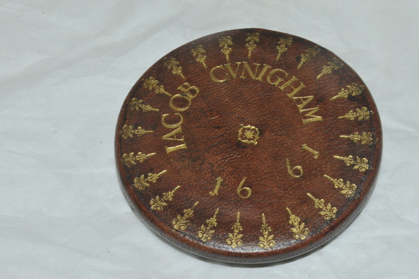 "This Galilean telescope has the name 'IACOB CUNIGHAM' and the date '1661' stamped onto the objective lens cap, making it one of the oldest dated telescopes in Britain. The two draw tubes are made of wood covered in marbled vellum, while the barrel and lens caps are made of wood covered in red leather with gold-tooled decoration. The eyepiece tube also has three gold-tooled stop lines identified by the German words 'NAHE', 'WEITH' and 'OVERSICHTIG'. These indicate different focusing lengths and suggest that the telescope was probably made in Germany. Jacob Cunigham may have been either the maker or the original owner of the telescope. The larger draw tube also has a single gold-tooled stop line. The curious shape of the barrel is designed to accommodate a large objective glass. At this time it was easier to grind a large lens than a small one. Brass diaphragms over the end of each lens have been used to reduce their apertures" (Royal Museums Greenwich).
