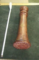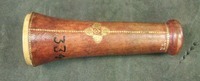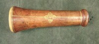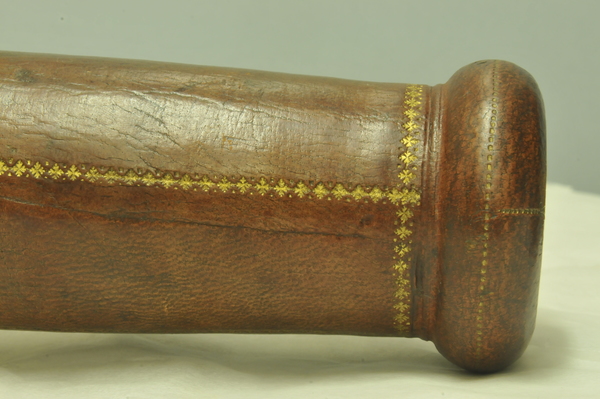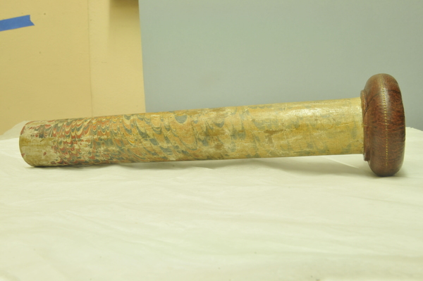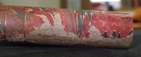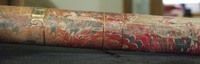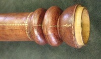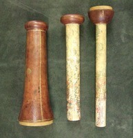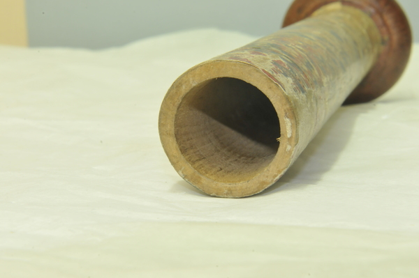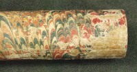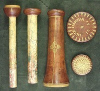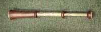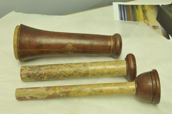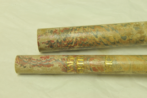 Extensions of tubes are marked with pins; each mark is accompanied by a pin that appears to do nothing else. Interior stops are made of brass. Tubes are made of wood covered with leather. Draws are covered with combed marbled paper. Each draw is wood, all the way through, made of a single piece of [apple?] wood, turned on a lathe. Tubes are snug, with leather fitting tightly on the wooden firmament.