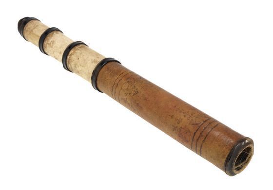 "This barrel and three draw tubes of this telescope are covered in vellum and the barrel is decorated with gold tooling. Stop lines on the draw tubes indicate the optimum working length of the telescope. The lenses are set in horn mounts, although the objective lens (which would have been non-acrhomatic) is now missing. There is a sliding eyepiece cover made of brass" (Royal Museums Greenwich).