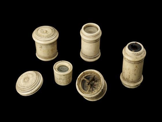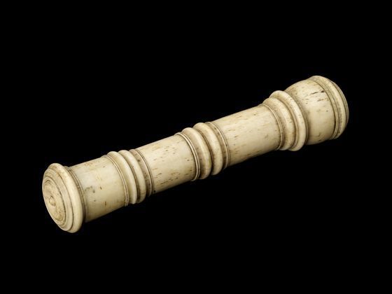 "This instrument unscrews into a number of parts which can be assembled into different optical instruments. It can be used as a telescope, but when the barrel is unscrewed a simple microscope, or flea-glass, is also revealed. Using this, a specimen stuck on a pin (now missing) can be viewed through a small lens. The other accessories include a sundial. This type of multi-purpose object was common around 1700" (Royal Museums Greenwich).