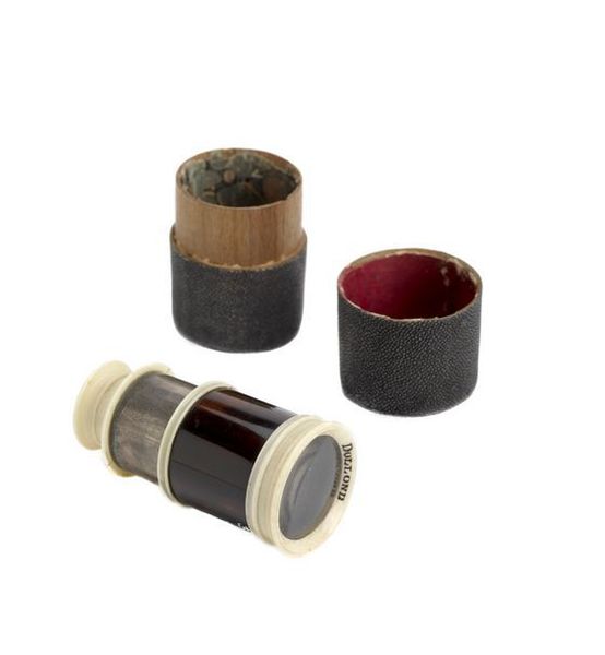 "Small Galilean telescopes like this were made as personal accessories to fit in the pocket. The barrel of this example is made of tortoiseshell and there is a single draw tube of silvered brass. The lenses are set in turned ivory mounts with the maker's name engraved on the objective lens mount. The original case, which is made of sharkskin over wood, also survives" (Royal Museums Greenwich).