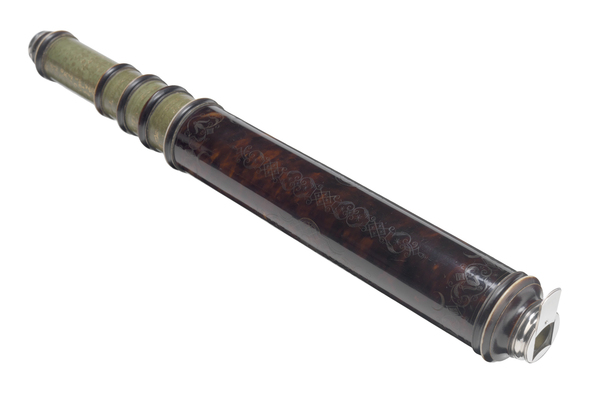 "This non-achromatic telescope has four draw tubes made of vellum and decorated with gold-tooled motifs. Unusually, it has a tortoiseshell barrel inlaid with silver, and ivory and silver fittings, including a sliding objective and eyepiece lens covers. Stop lines on the draw tubes indicate the optimum working length of the telescope. It is also interesting to note that the aperture of the objective lens cover is much smaller than the objective lens. It was easier at this time to make a larger lens of good quality and then to stop this down to the size required" (Royal Museums Greenwich).