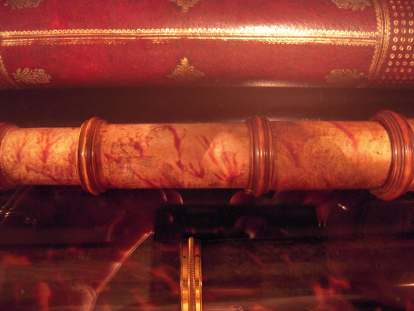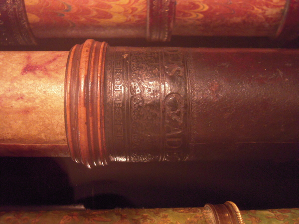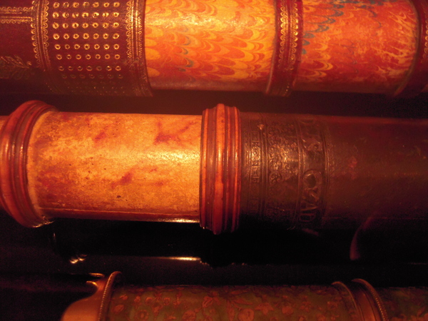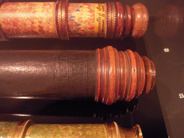 "Tubes of pasteboard. Main tube covered with dark leather, with blind tooling. Fittings made of wood. Six drawtubes, covered with decorated paper. The signature is stamped on the main tube: ‘FECIT CANONI: SABRD VICENSIS’ and: ‘FERDINANDUS CZADECZKY’. Maximum length 111 cm, Ø 5.5 cm. Late seventeenth century .